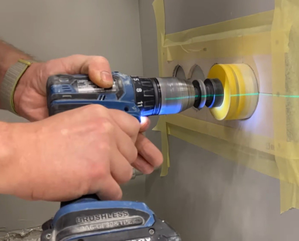 После разметки просверлите отверстие с помощью специальной коронки и шаблона для сверления. Глубина должна быть равна соответствующему параметру подрозетника. В этом случае после установки механизма розетки, лицевая часть с крепежной панелью будет установлена вровень со стеной.