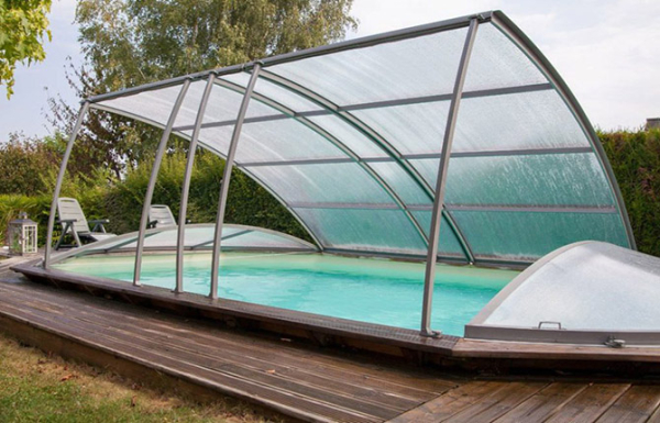 Для небольших бассейнов часто используется распашная конструкция крыши, чтобы освободить водоем для купания, достаточно распахнуть или сдвинуть створки в сторону. Схема достаточно простая, но после распахивания створок защитного навеса над головой купающихся уже не будет.