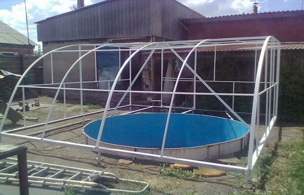 Для больших водоемов крыши изготавливают из металлопластикового оконного профиля. Готовые секции можно заказать у компании, выпускающей окна и фурнитуру к ним.
