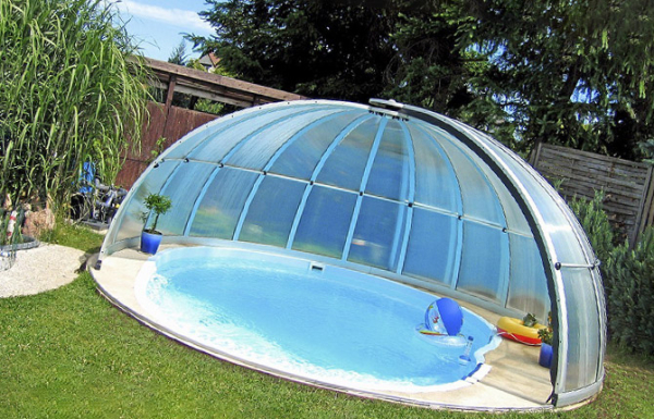 Существуют также купольные модели крытых бассейнов, у которых купол можно собирать в пакет, открывая часть зеркала для солнечного света.