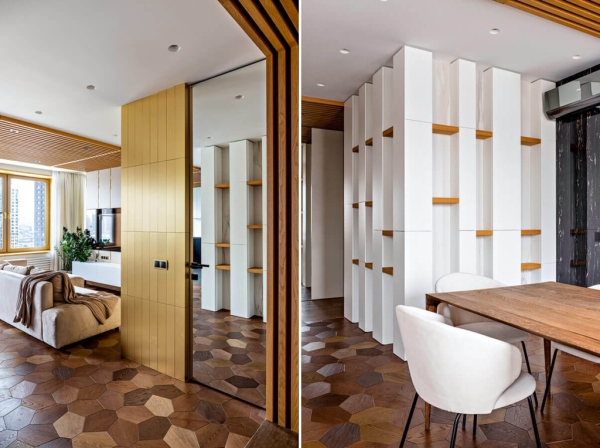 Были использованы самые прогрессивные материалы: крупноформатный керамогранит, микроцемент, искусственный камень Corian, модульный паркет Finex, латунные панели. Двери в потолок вытягивают пространство, и в целом теряется ощущение дверей как таковых.