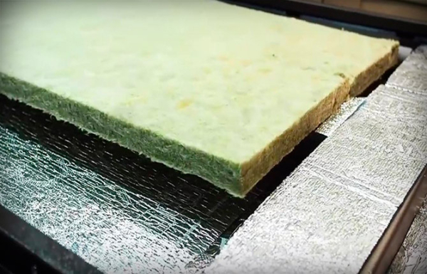 Далее на тыльную сторону лицевой панели укладывают слой фольгированного пенополиэтилена. Лист утепления должен нахлестывать на внутренние ребра и даже на торцевую поверхность. Это обеспечит надежную защиту от любых сквозняков.
