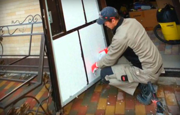 Чуть сложнее выглядит процесс укладки утепления на входных дверях с усиленной металлической лицевой панелью. Это не бронедверь, металлическое полотно невозможно разобрать без использования специального инструмента. Утепление «брони» выполняется еще на этапе сборки.