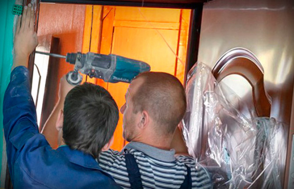 Нужно смонтировать замок входной двери и вернуть на место металлические закладки, к которым прикручивались навесы дверей.