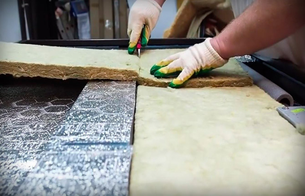 Перед укладкой лист каменной ваты вырезают по размерам ниш внутри дверного полотна. Утепление должно вкладываться в нишу с небольшим сжимающим усилием. Такой способ будет удерживать материал внутри входной двери лучше всякого клея.