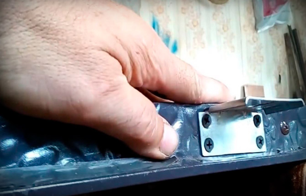 Последний этап — нужно надеть металлическую облицовку входной двери, аккуратно осадить ее по периметру, прикрепить навесы и накладную планку замка.