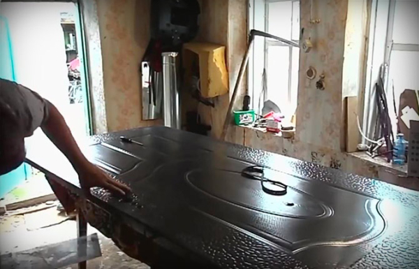 Чтобы заложить утепление внутрь металлического полотна, дверь нужно снять с петель и уложить на верстак. Вес металлической конструкции может достигать 80-100 кг, поэтому демонтаж лучше проводить с одним или двумя помощниками.