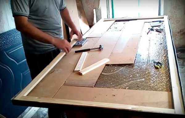 Прежде всего входную дверь нужно снять с петель и уложить на верстак или столярный стол. Можно заложить утепление, что называется, на весу, не снимая полотно, как на фото.