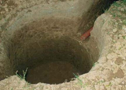 Котлован для герметичной выгребной ямы, состоящей из 2 бетонных колец. Заглубление канализационной трубы – около 0,8 м, высота резервуара в готовом виде – 2,5 м