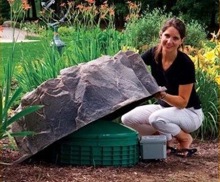 В последнее время принято маскировать канализационные сооружения, особенно в том случае, если они выглядят недостаточно эстетично. Для этой цели приобретают декоративные изделия, имитирующие зеленые насаждения или крупные камни.