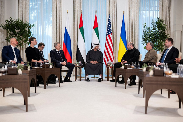 Главы делегаций, участвующих в организованных ОАЭ трехсторонних переговорах между США, Россией и Украиной, в центре — шейх Мохаммед бен Заид Аль Нахайян